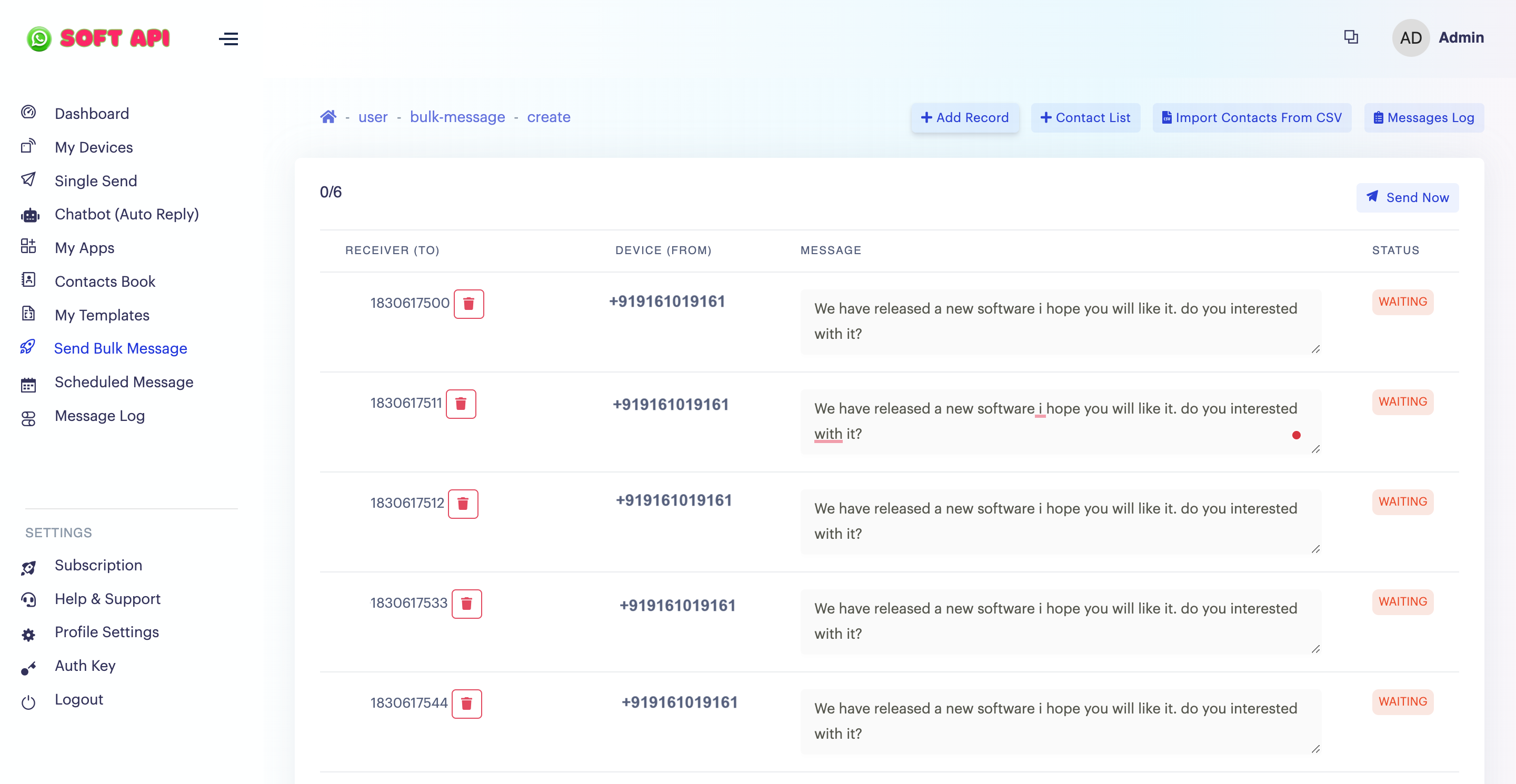 WA Bulk messaging is the dissemination of large numbers of messages for delivery to Soft API. It is used by media companies, banks and other enterprises and consumer brands for a variety of purposes including entertainment, enterprise and mobile marketing.